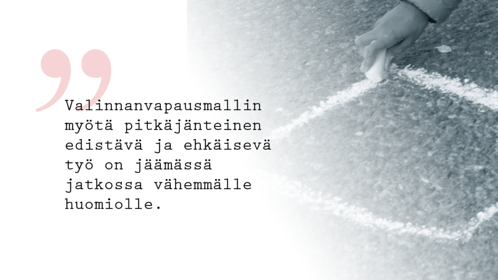 Valinnanvapaus sinällään on hyvä ja kannatettava asia. Se, että valinnanvapaus kirjataan lain nimeen, ei vielä tarkoita sitä, että potilailla ja asiakkailla olisi käytännössä mahdollisuus käyttää valinnanvapautta palveluissa. Valinnanvapausmalli sopii yksittäisiin ja selkeisiin hoitotoimenpiteisiin. Hyvässä asemassa oleville perheille valinnanvapaus voi luoda lisää mahdollisuuksia valita palveluita. Se sopii kuitenkin huonosti tilanteisiin, jotka vaativat moniammatillista työskentelyä ja pitkäkestoista sosiaali- ja terveydenhuollon asiakkuutta. Etenkin heikommassa asemassa olevien perheiden tilanne uhkaa huonontua. Miten toimivista palveluketjuista ja -kokonaisuuksista vastataan esimerkiksi lastensuojelu-, mielenterveys-, vammais- tai päihdepalveluiden asiakkaana olevien perheiden kohdalla?