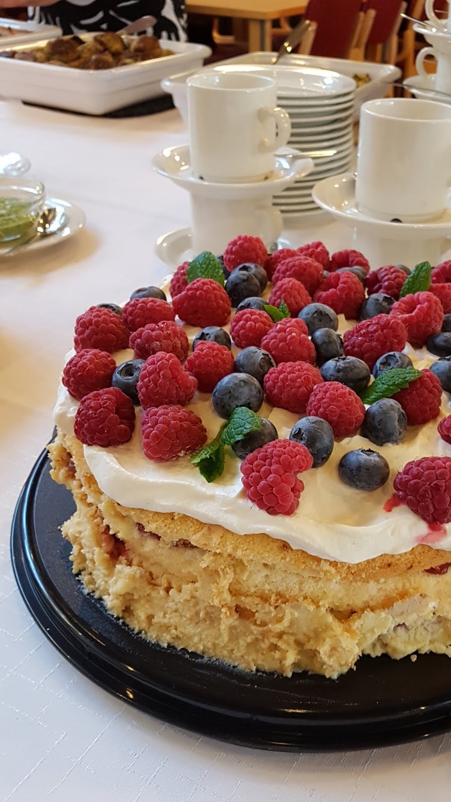 Jälkiruuaksi oli gluteiinitonta mansikkakakkua kera teen tai kahvin. Kakun reunoille leviteltiin valkosuklaakuorrutetta ja päälle vaniljasokerilla maustettua vispikermaavaahtoa ja kotimaisia marjoja.