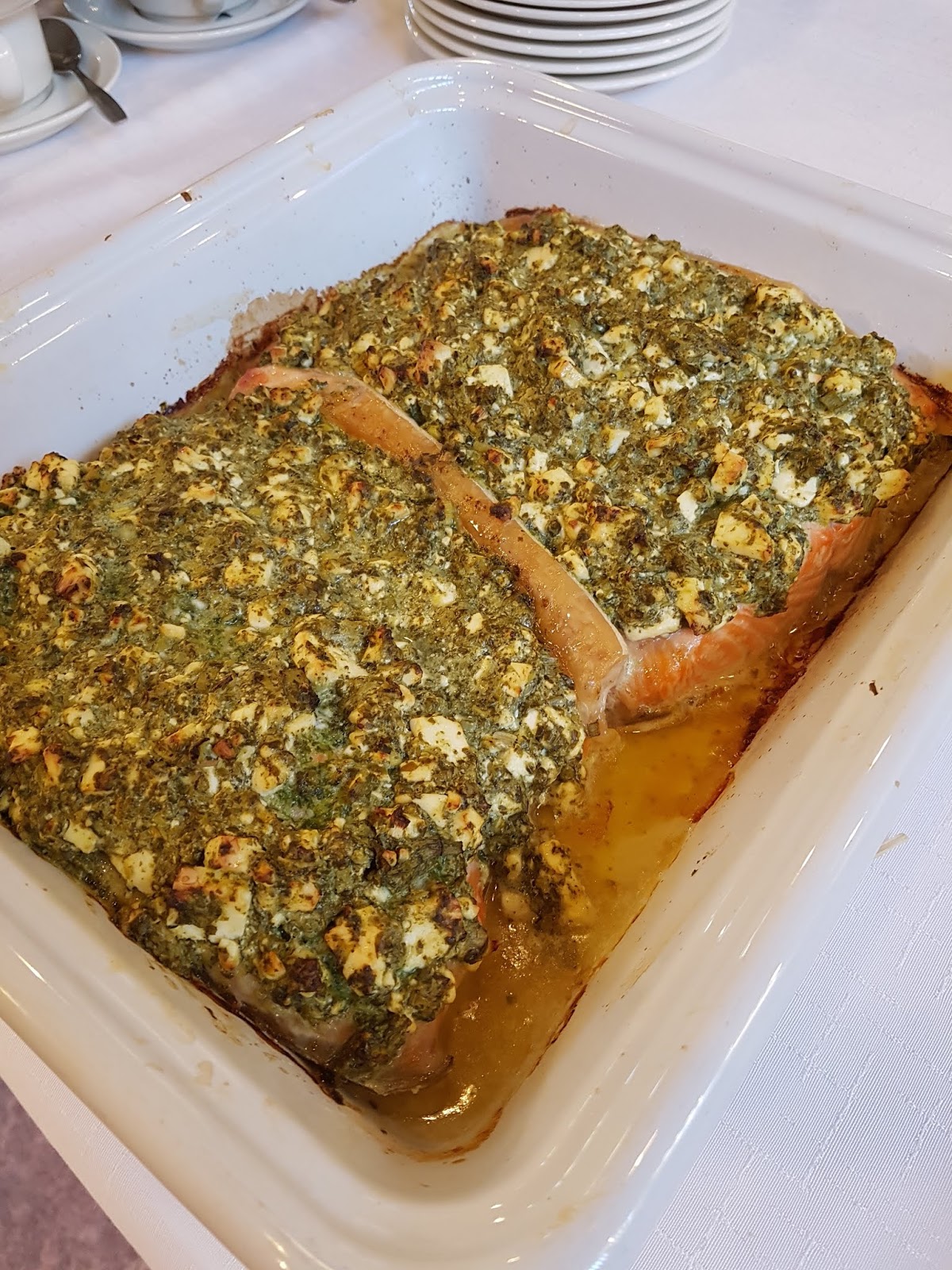Täytettyjen lohitaskujen ohjeesta poiketen käytimme lohifileitä, jotka kuorrutimme ohjeen mukaan pinaatilla, purjolla ja salaattijuustolla.