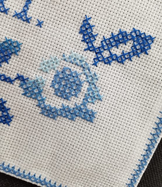 Kirjoin työn käyttäen sinisen eri sävyjä. Kirjoin isommilla ristopistoilla – kolme ristipistoa senttimetrille.