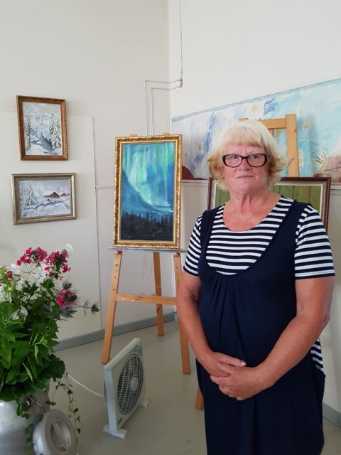 Juttelin näyttelyä valvomassa olevan Seija Nummen kanssa. Hän kertoi olevansa Ristijärvelle muuttanut paluumuuttaja. Seija on harrastanut maalaamista jo 17 vuotta. Ristjärvelle muutettuaan hän meni kansalaisopiston taidepiiriin mukaan. Kuvassa taustalla olevat talvimaisemat ja maalausjalustalla oleva revontuli-maalaus ovat Seijan tekemiä. Näiden töiden lisäksi oli näyttelyssä muitakin Seijan maalauksia.