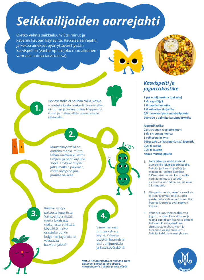 Oletko valmis seikkailuun? Aarrejahdin tarkoituksena on etsiä helpon kasvipellin reseptin ainekset kaupan käytävillä seikkaillen.