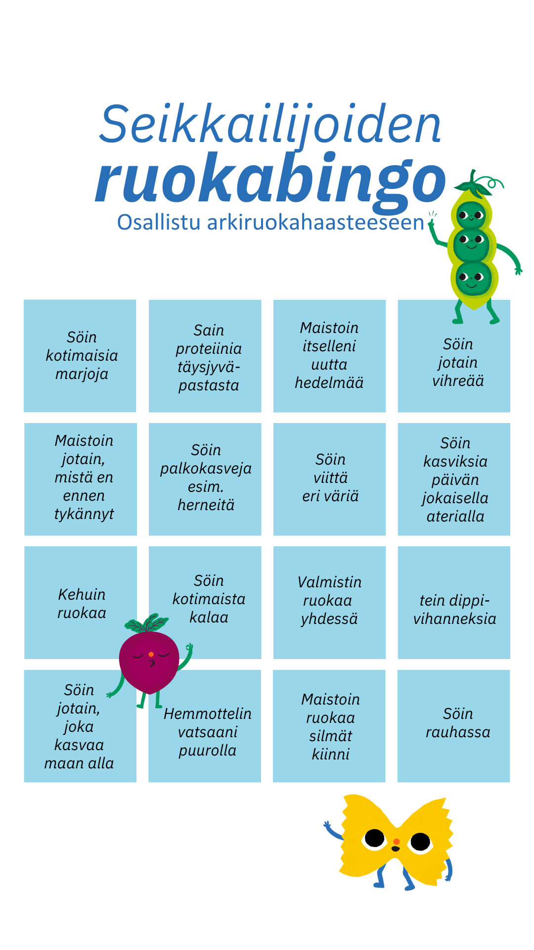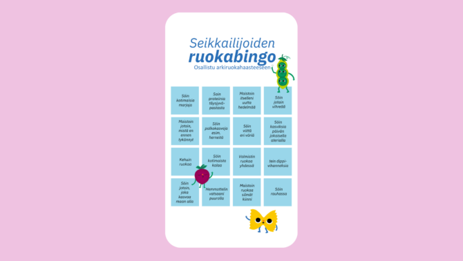 Tulosta itsellesi Kotikeittiön seikkailijoiden Ruokabingo. Seikkailijoiden ruokabingossa kokeillaan uusia makuja, syödään värikkäästi ja huomataan, kuinka monipuolinen arjen ruoka voi olla.