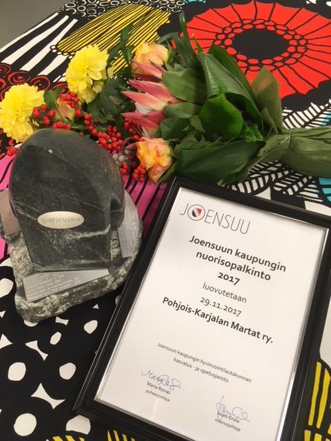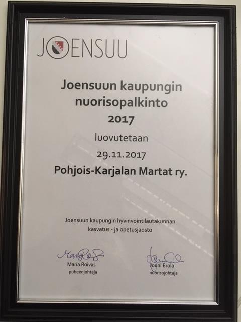 Joensuun kaupungin hyvinvointilautakunnan kasvatus- ja opetusjaosto on myöntänyt vuoden 2017 nuorisopalkinnon Pohjois-Karjalan Martat ry:lle. Palkinnon perusteluissa todetaan, että Pohjois-Karjalan Martat on aktiivinen alueellinen toimija, joka toimii Joensuussa lasten ja nuorten arjen tukijana.