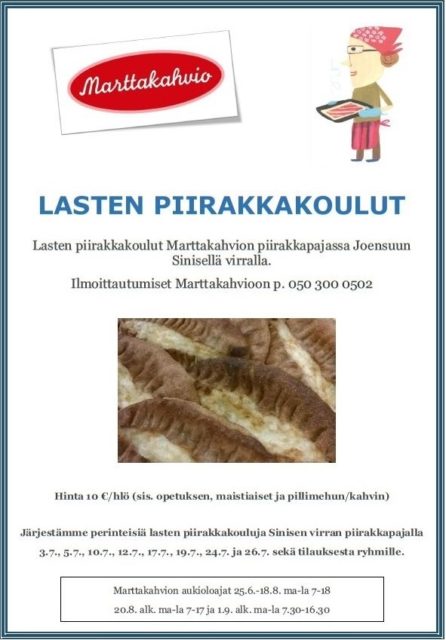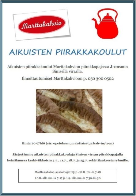 Marttakahvion piirakkapajassa Joensuun Sinisellä virralla: heinäkuussa tiistaisin ja torstaisin 3.7., 5.7., 10.7., 12.7., 17.7., 19.7., 24.7., 26.7. ja 31.7. sekä tilauksesta ryhmille. Hinta 10 €/hlö (sis. opetuksen, maistiaiset ja pillimehun/kahvin)