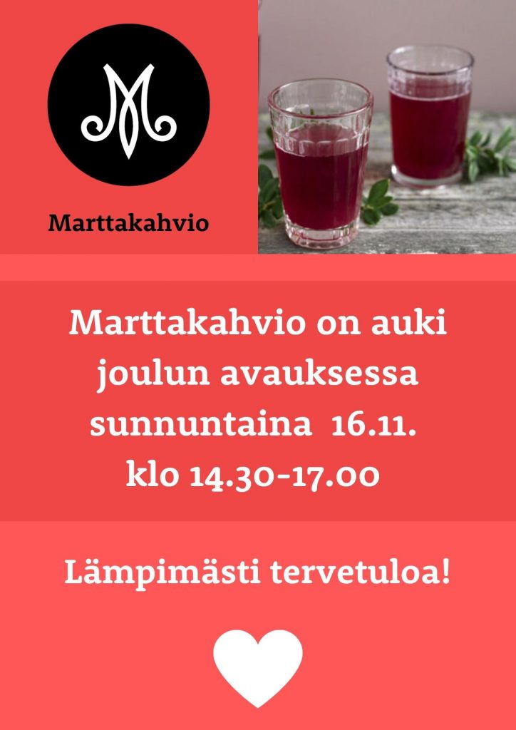 Joensuun virallinen joulunavaus valtaa torin sunnuntaina 16. marraskuuta. Marttakahvio on auki tapahtumapäivänä klo 14.30-17.00. Myytävänä joulutorttuja ja glögiä.
