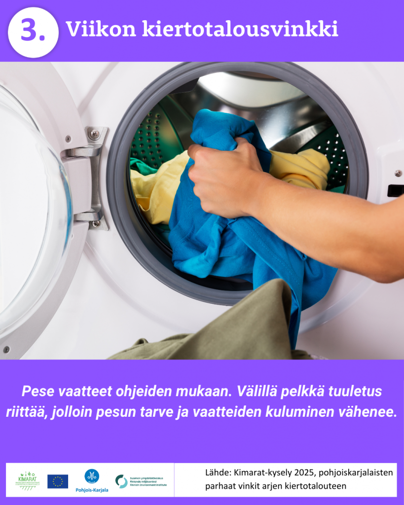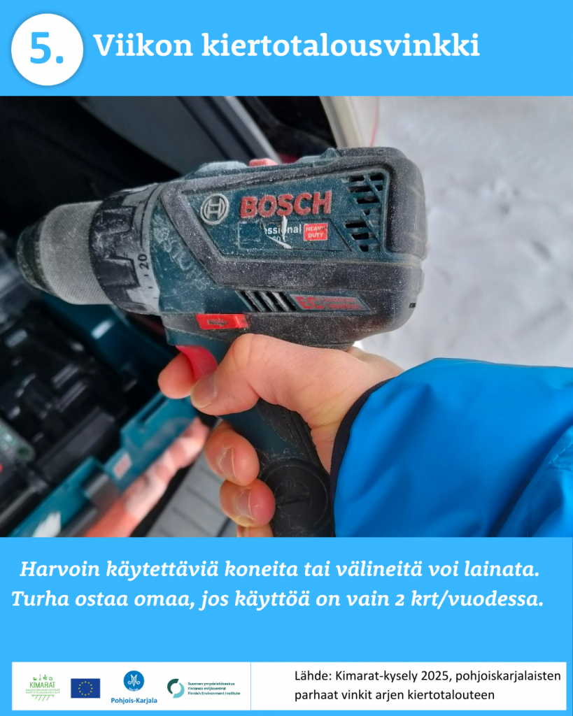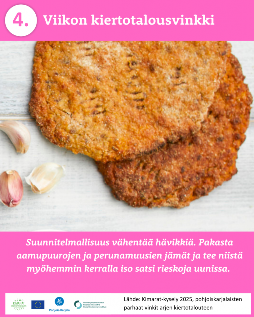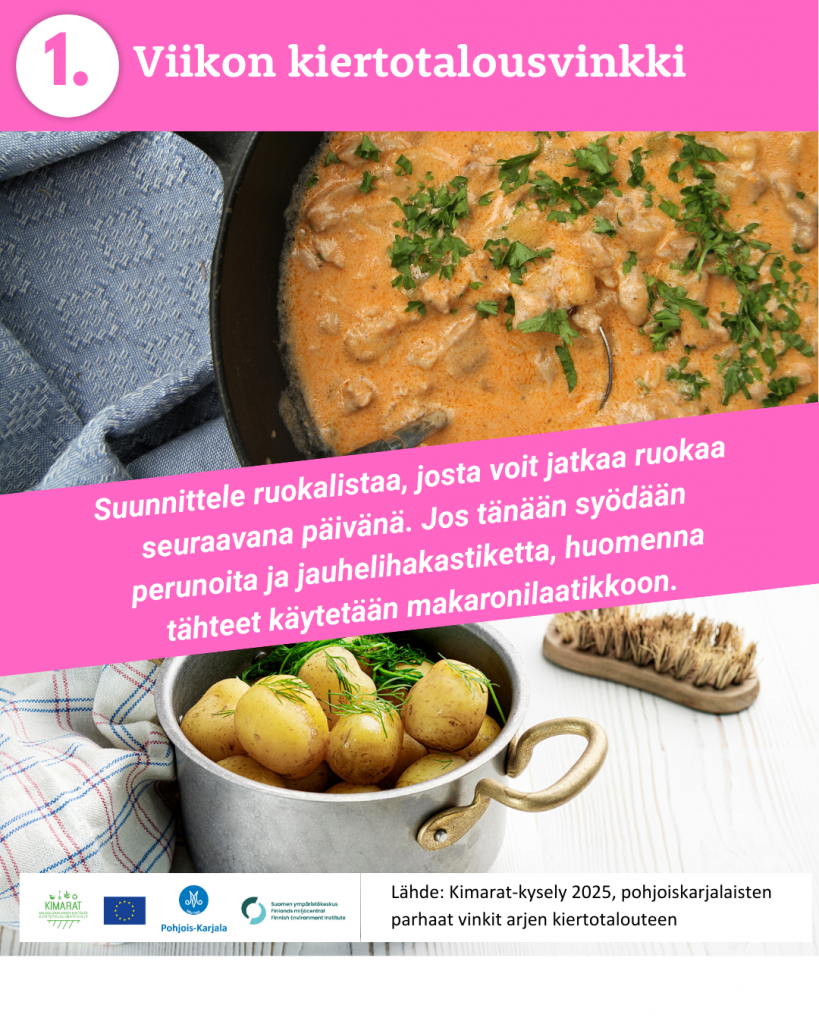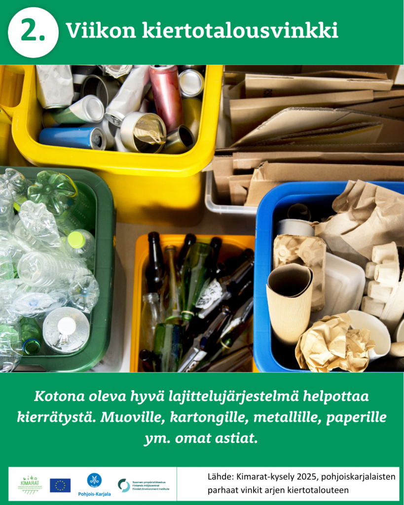 Pyysimme vuonna 2025 pohjoiskarjalaisia kertomaan omista arjen kiertotalouden käytännöistä. 370 vastaajaa paljasti meille omat parhaat vinkkinsä ruokahävikin ehkäisyyn, jätteidne lajitteluun, kompostointiin, tavaroiden korjaamiseen, huoltamiseen ja lainaamiseen sekä moneen muuhun arkiseen askareeseen. Kiitos kaikille vinkkejä jakaneille!