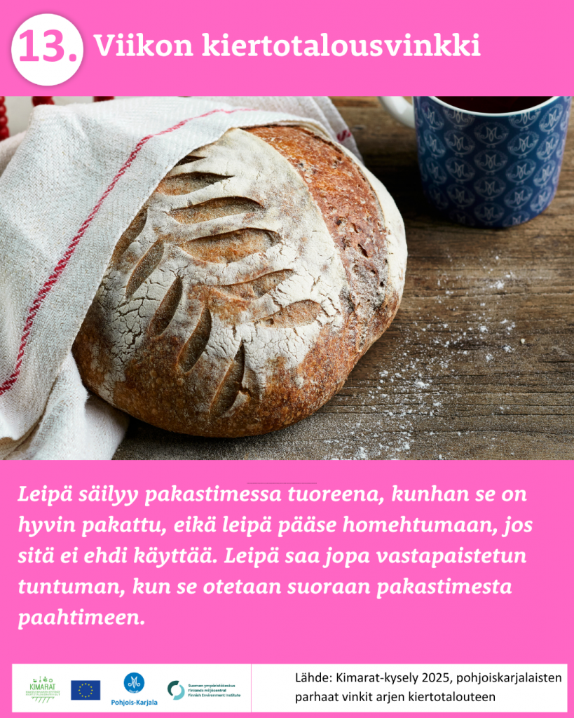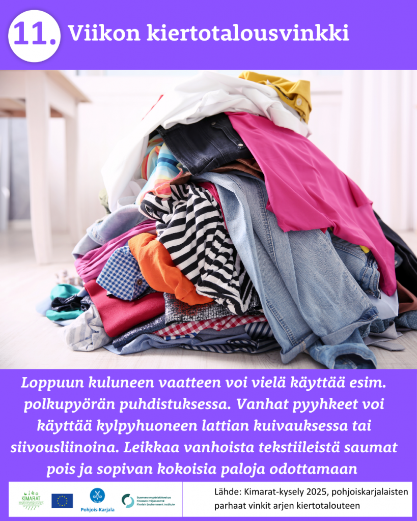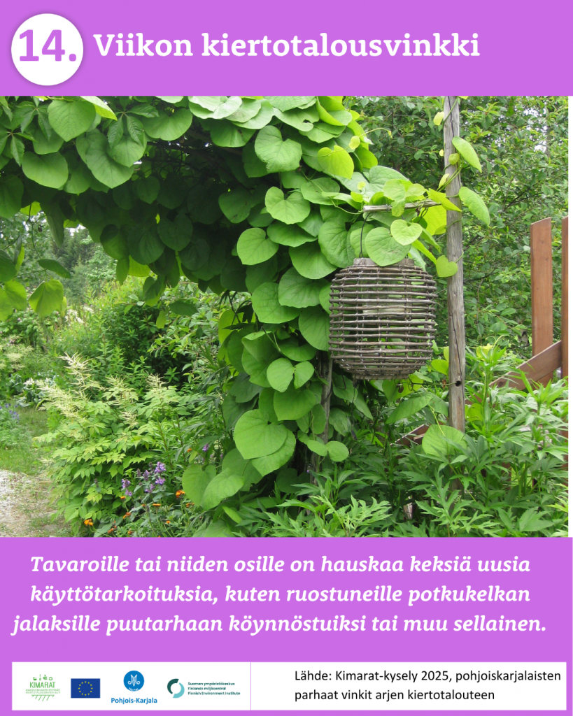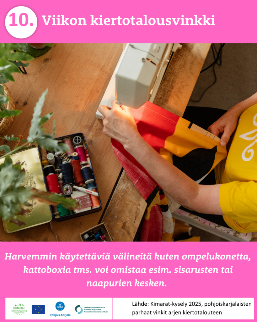 Pyysimme vuonna 2025 pohjoiskarjalaisia kertomaan omista arjen kiertotalouden käytännöistä. 370 vastaajaa paljasti meille omat parhaat vinkkinsä ruokahävikin ehkäisyyn, jätteidne lajitteluun, kompostointiin, tavaroiden korjaamiseen, huoltamiseen ja lainaamiseen sekä moneen muuhun arkiseen askareeseen. Kiitos kaikille vinkkejä jakaneille!