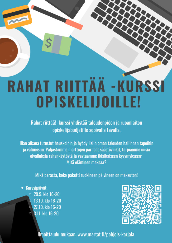 Rahat riittää! -kurssi on tarkoitettu opiskelijoille ja samalle ryhmälle on neljä kokoontumiskertaa, joista ensimmäinen on 29.9. klo 16-20. Teemme jokaisella kerralla ruokaa tai leivomme ja osallistujat saavat Arjen taitoja -kirjan. Kurssilla on max 6 osallistujaa, pidämme yhdessä huolta turvaväleistä ja käsihygieniasta. Käytössämme on reilun kokoinen opetuskeittiö. Kurssikerralle ei saa tulla sairaana.