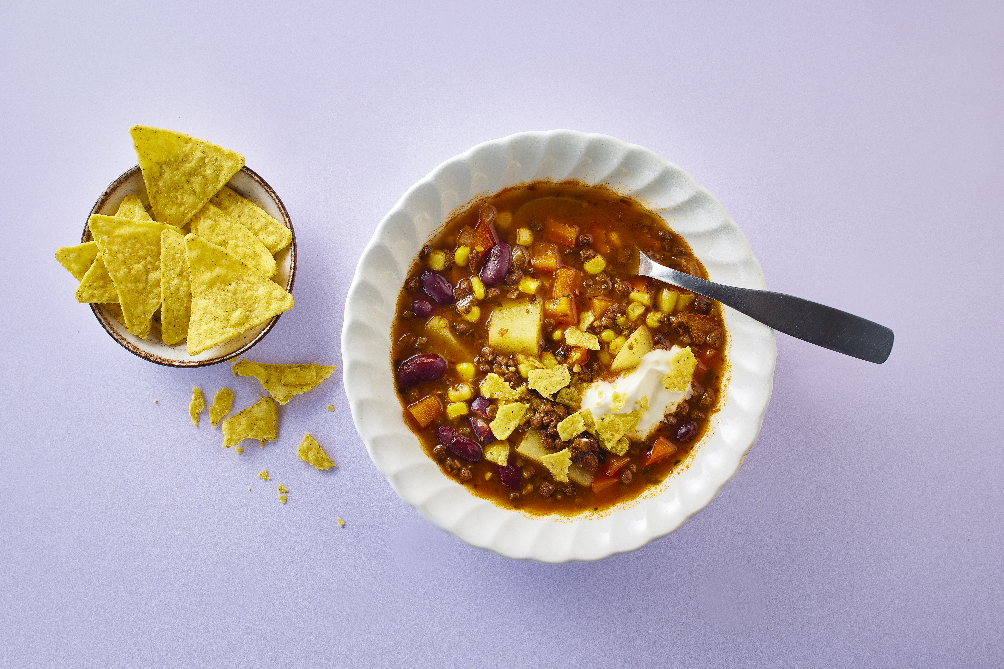 6. Valuta ja huuhtele pavut siivilässä. Lisää liemeen paprika, pakastemaissi ja pavut. Kuumenna uudelleen kiehuvaksi.