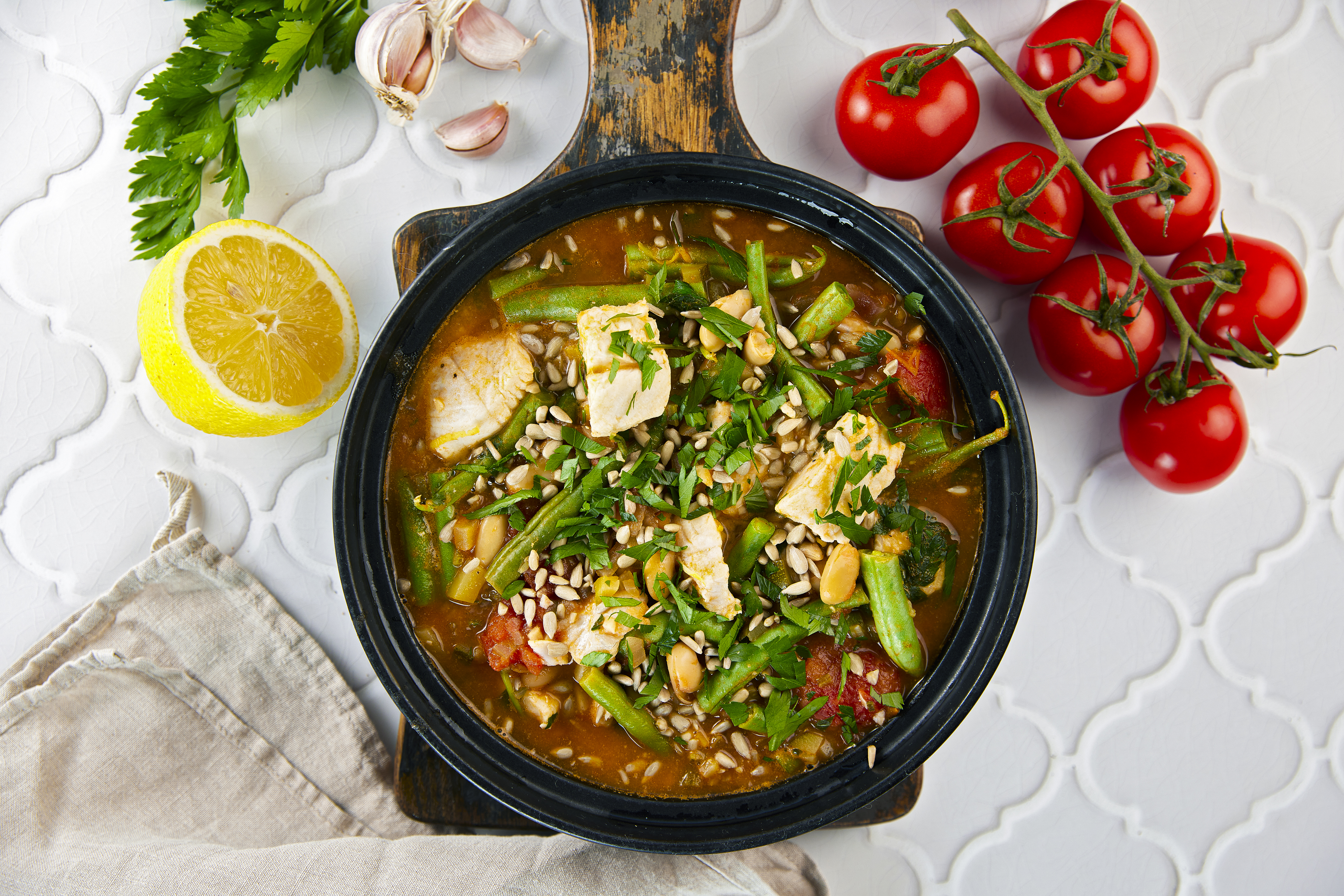 - Lisää kattilaan sitruunan kuori ja mehu. Ota kattila pois liedeltä ja tarkista maku! Lisää tarvittaessa suolaa tai pippuria. Hienonna persilja ja ripottele se ja siemenet padan päälle. Tarjoa pata vaalean leivän kanssa.