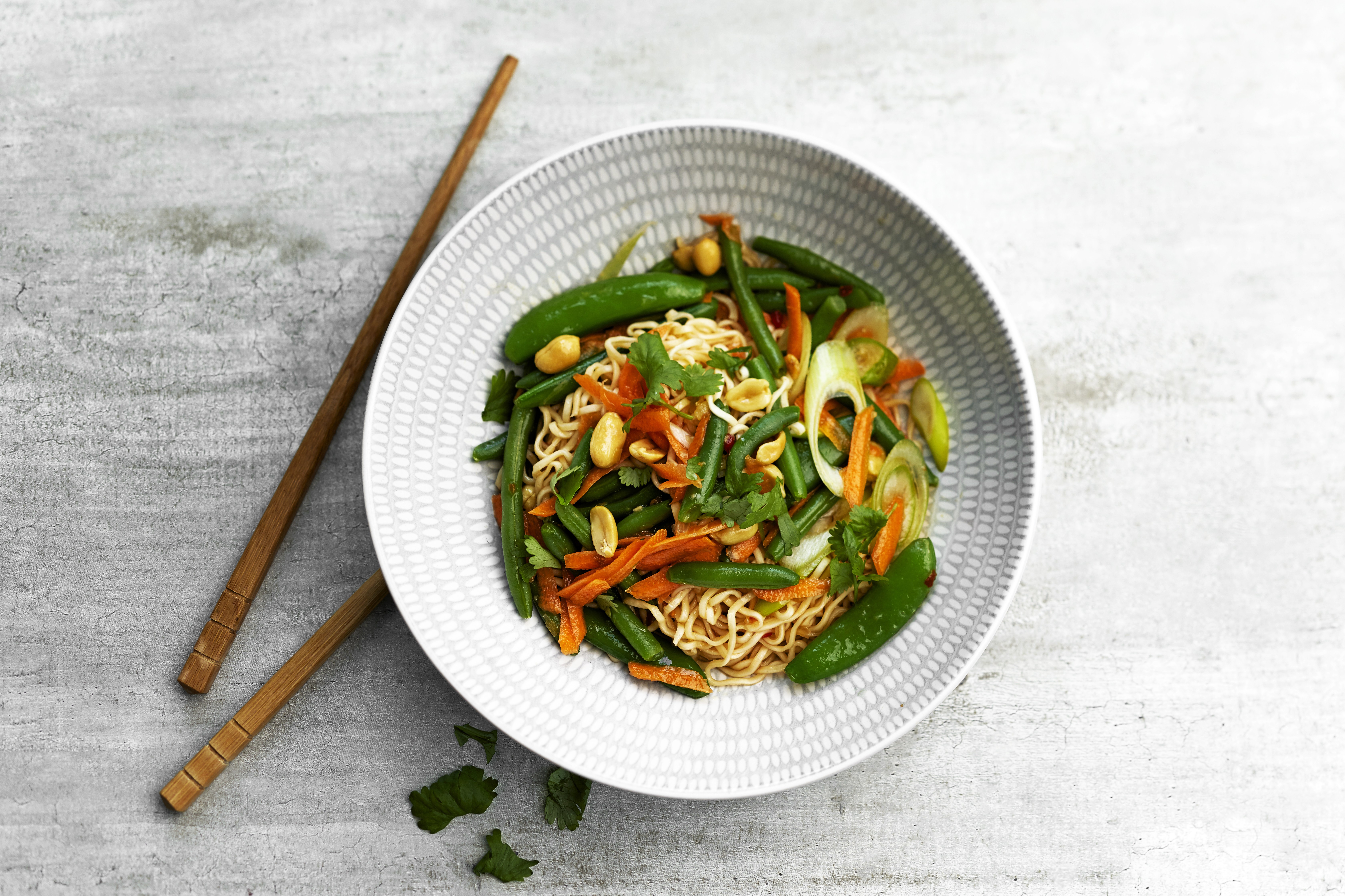 - Raasta porkkanat karkealla raastimella. Pilko kevätsipuli ohuiksi siivuiksi. Sekoita kaikki salaattiainekset nuudelien joukkoon ja ripottele pinnalle tuoretta, silputtua korianteria.