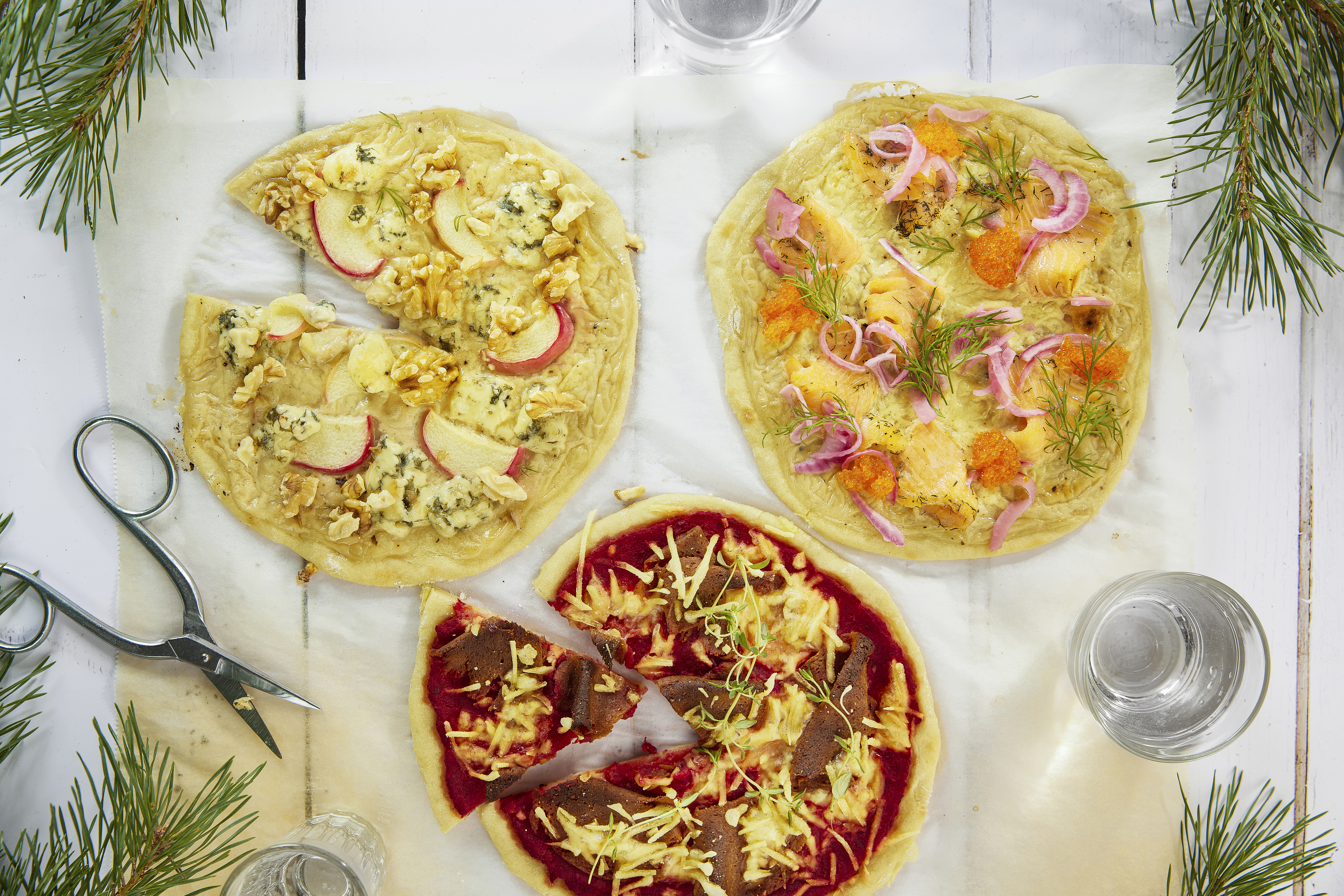 Joulupöydän tähteistä syntyy hauskoja jämäpizzoja. Perunalaatikko sujahtaa rieskamaiseen pohjaan, ja paistit, rosollit, kalat ja juustot toimivat loistavasti täytteinä. Päästä luovuus valloilleen ja kokeile erilaisia makuyhdistelmiä.