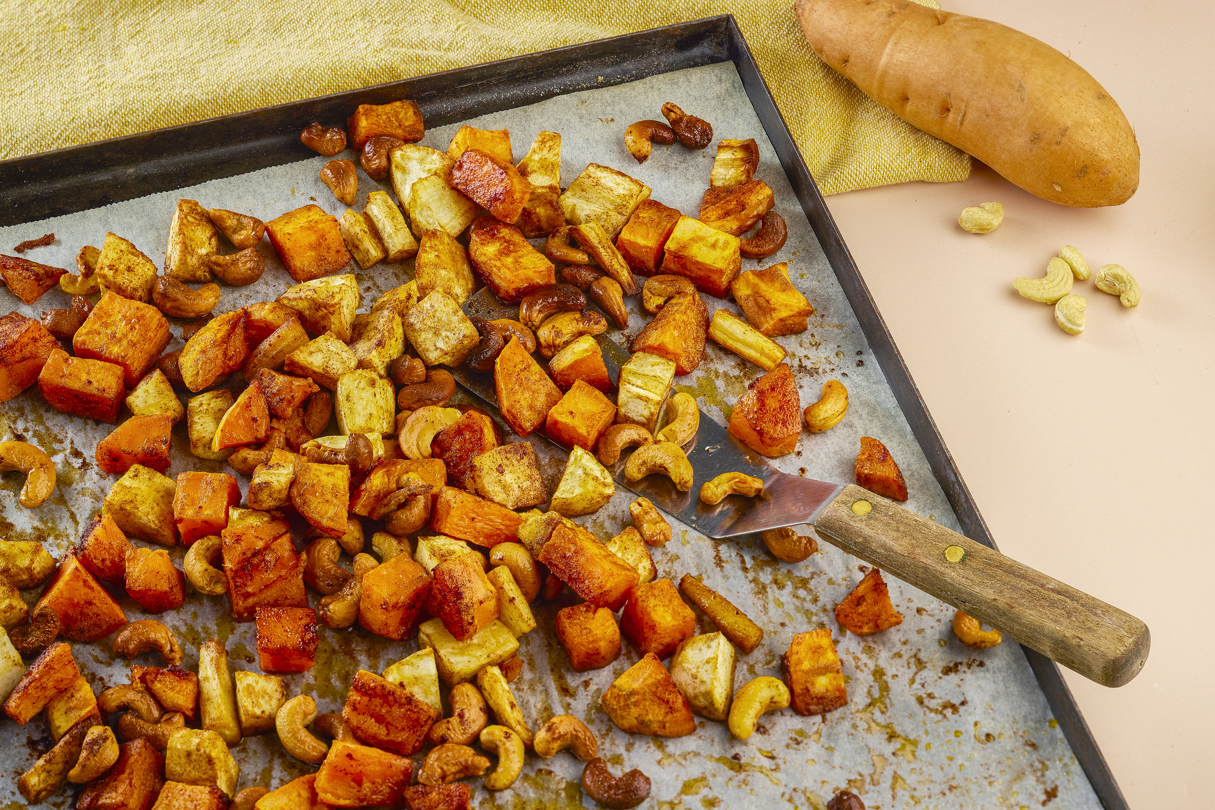1. Lämmitä uuni 200 asteeseen. Pese ja kuori bataatit ja palsternakat. Pilko juurekset samankokoisiksi paloiksi.