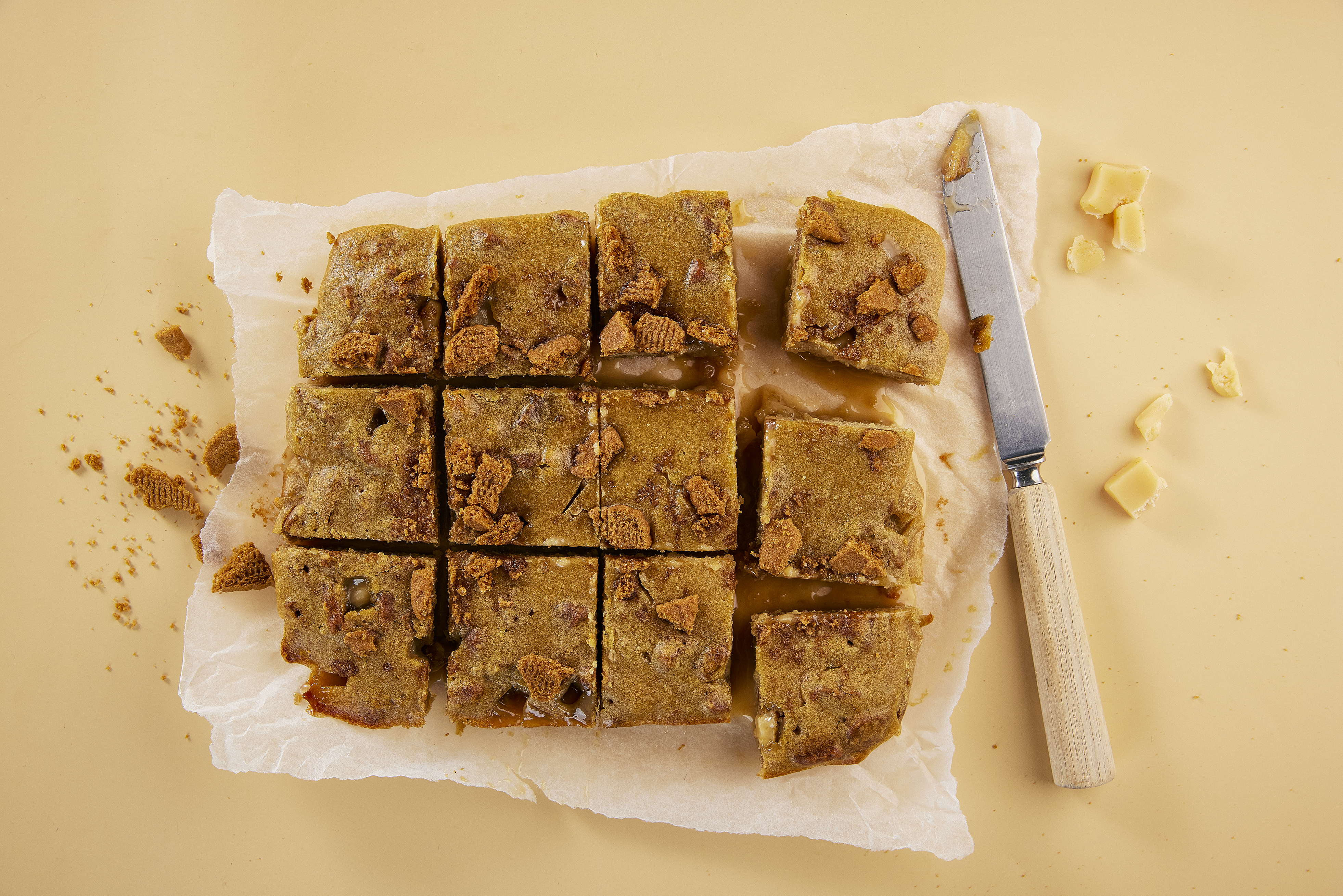 5. Levitä taikina vuokaan ja ripottele loput karamelli- ja keksipalat päälle.