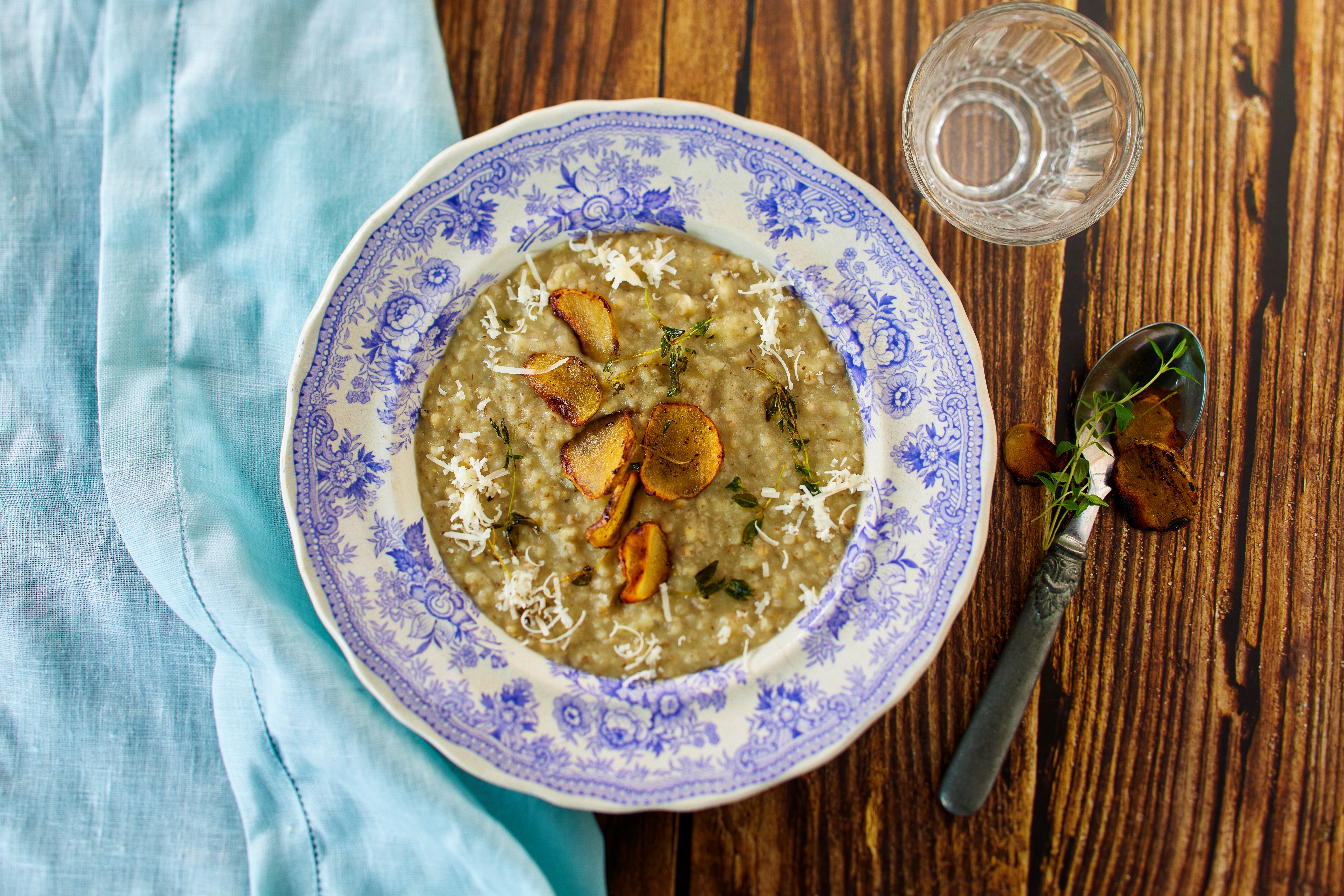 - Lisää lopuksi maa-artisokkasose, juustoraaste, sekä sitruunanmehu. Mausta pippurilla ja tarvittaessa suolalla. Ohratto saa jäädä löysäksi.