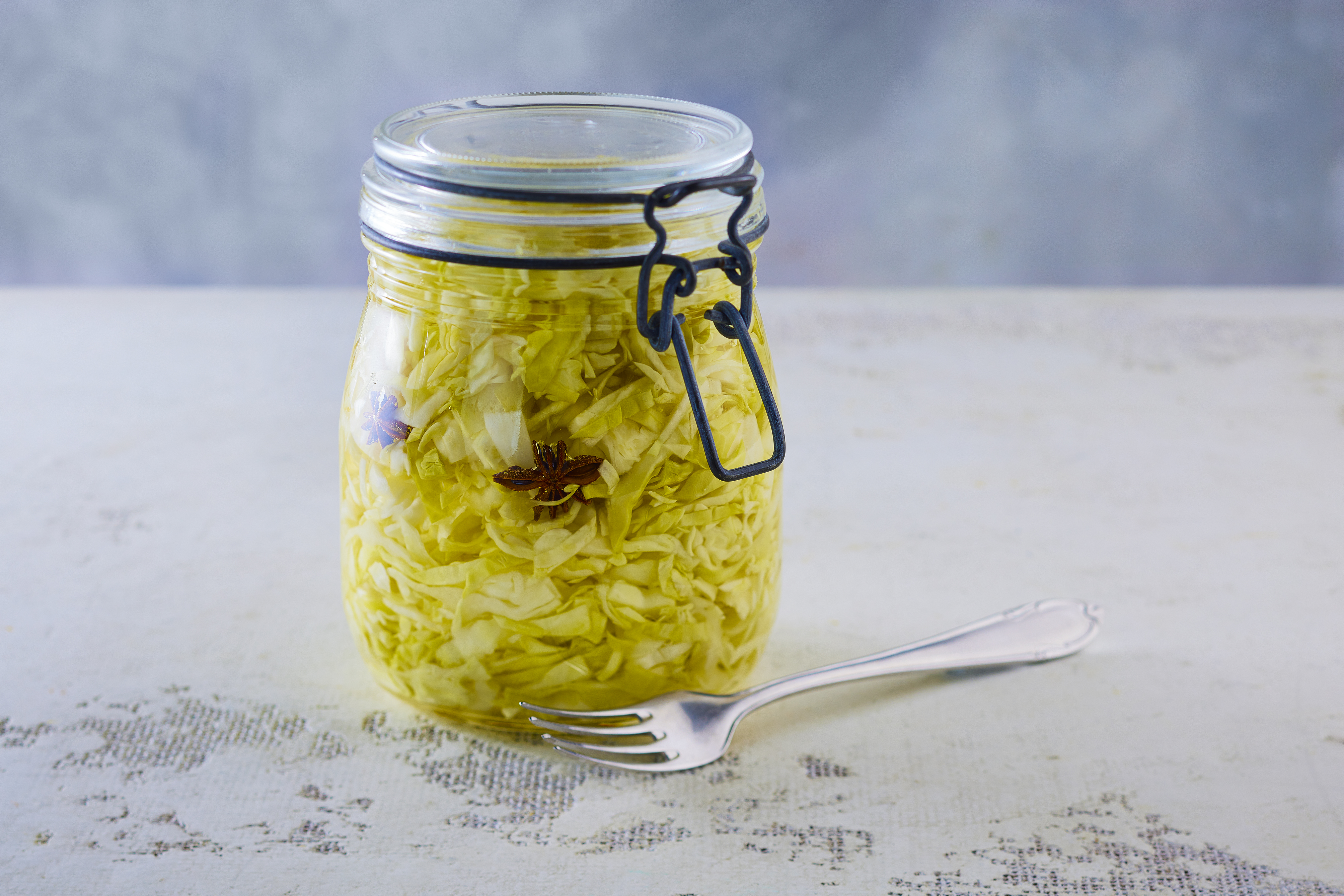 3. Pane kaali isoon lasipurkkiin. Paina tiiviiksi. Kaada etikkaseos kaalin päälle. Kaalin pitää peittyä kokonaan etikkaseoksella.