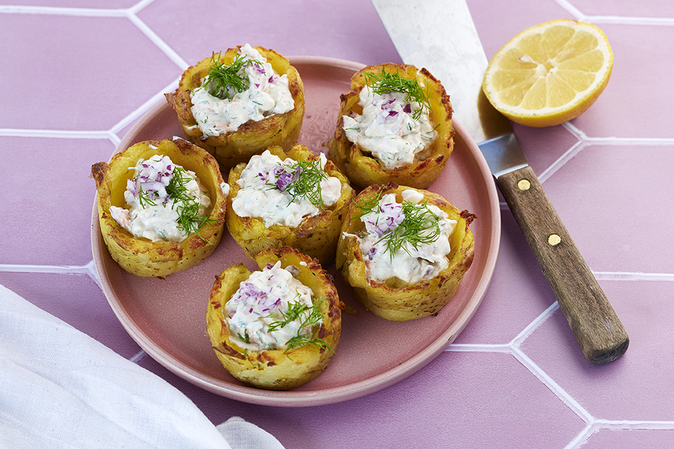- Nosta perunat vuoasta ja täytä mieleiselläsi täytteellä, esimerkiksi savukalamoussella.