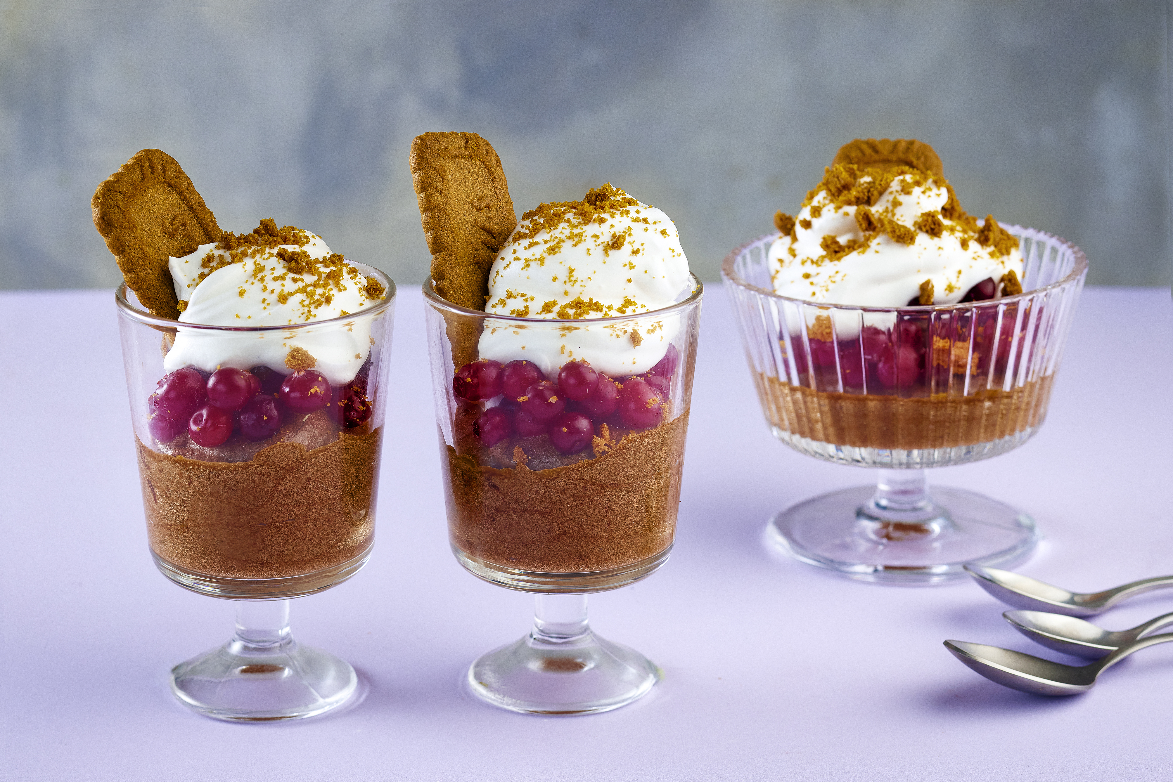 6. Ota jälkiruokakulhot jääkaapista. Jaa marjat kulhoihin suklaavaahdon päälle.