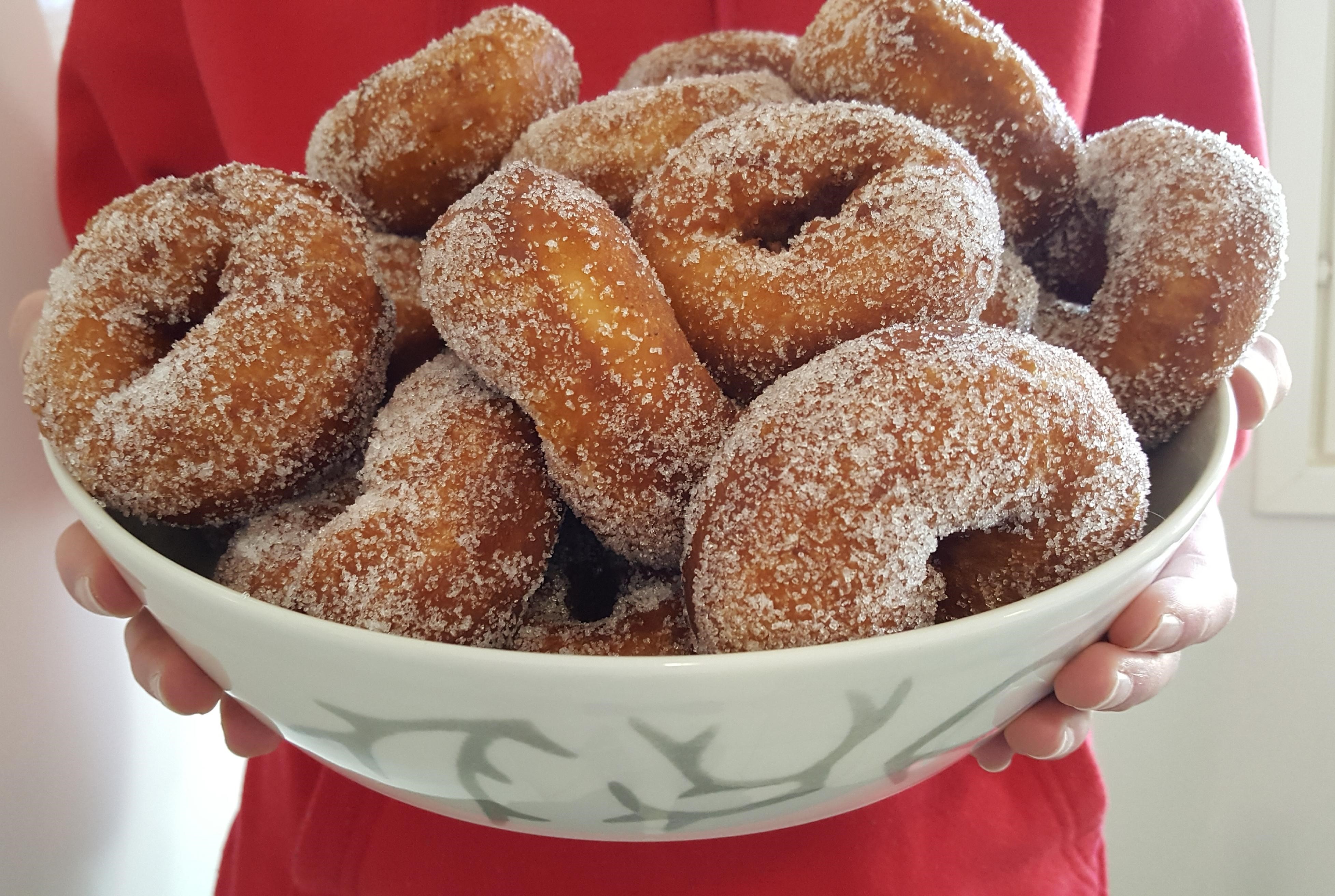 8.Pyöritä munkit lämpiminä sokerissa lautasella tai paperipussissa.