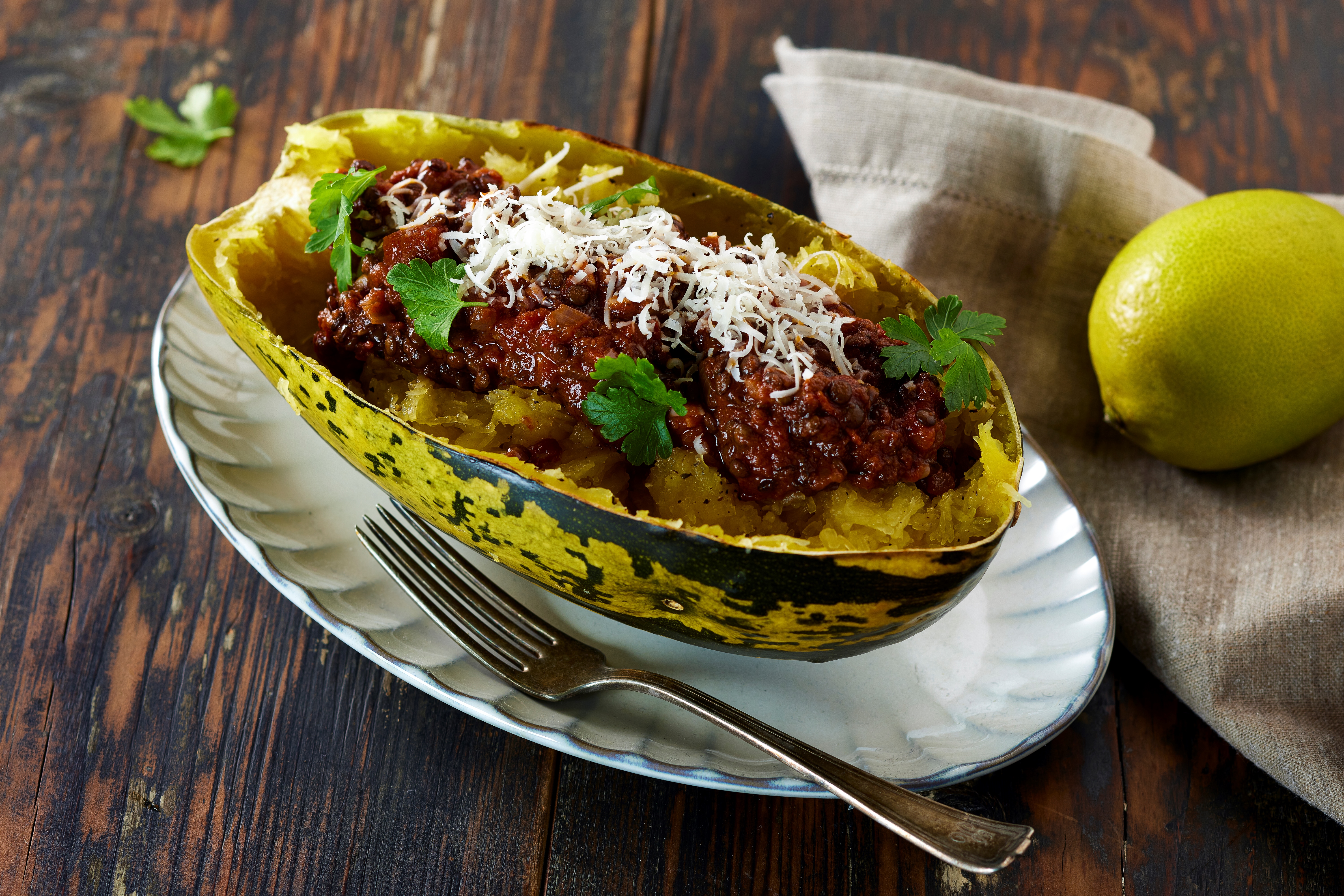 - Riivi kypsä kurpitsan liha haarukalla spagettimaisen irtonaiseksi kuoren sisään. Lusikoi kastiketta päälle.