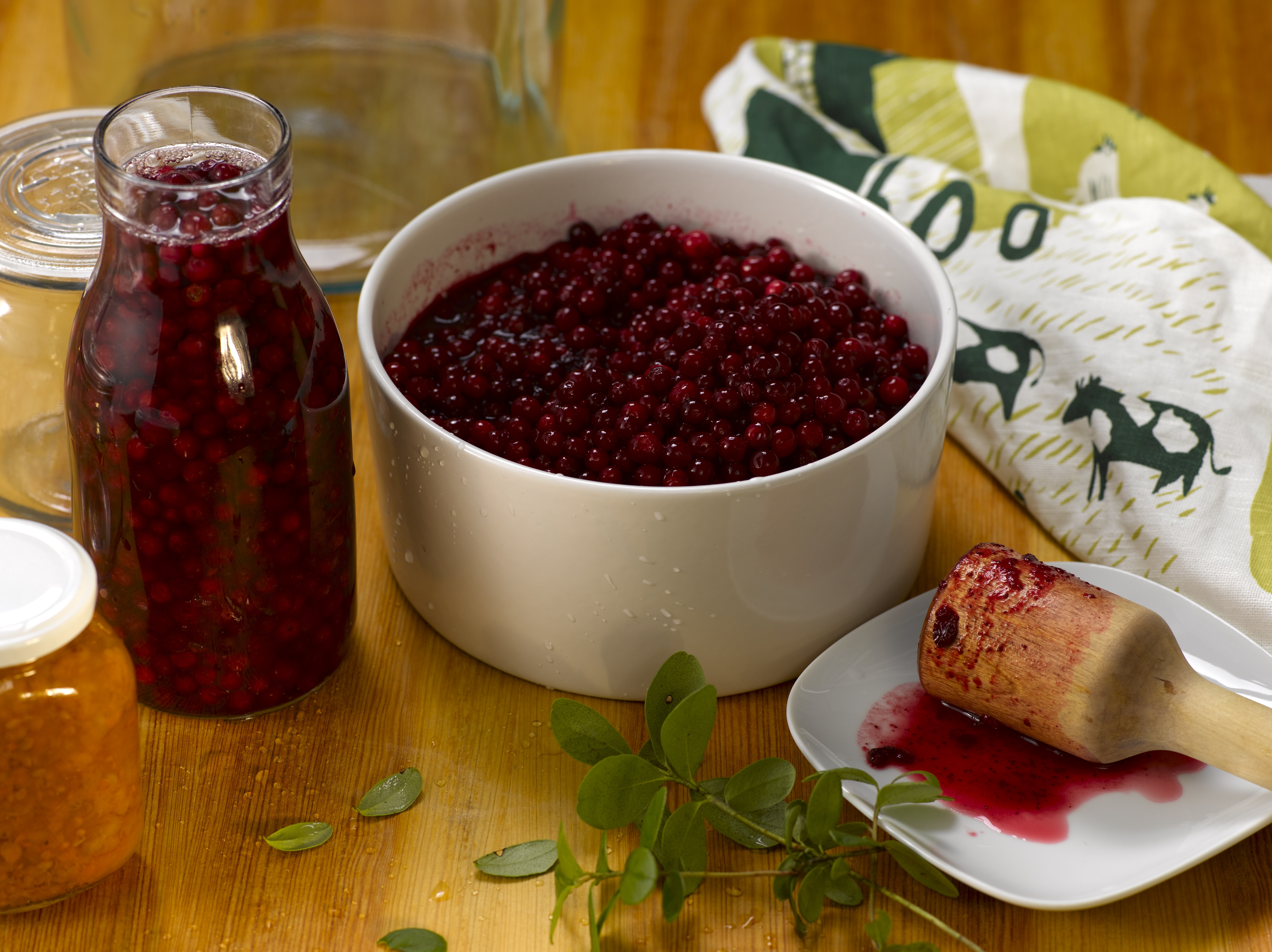 - Survo osa puolukoista, karpaloista tai lakoista niin, että mehua muodostuu riittävästi peittämään marjat.