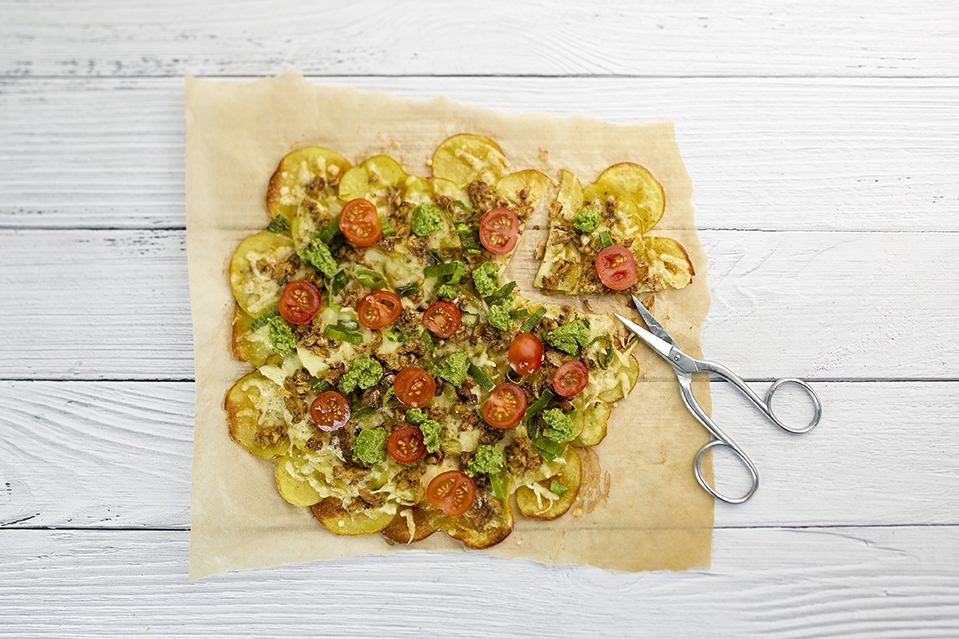 - Lisää esipaistettujen perunaviipaleiden päälle valutetut murennetut villikalapalat, kevätsipuli ja juusto. Parhaan lopputuloksen saat, kun laitat täytteitä maltillisesti.