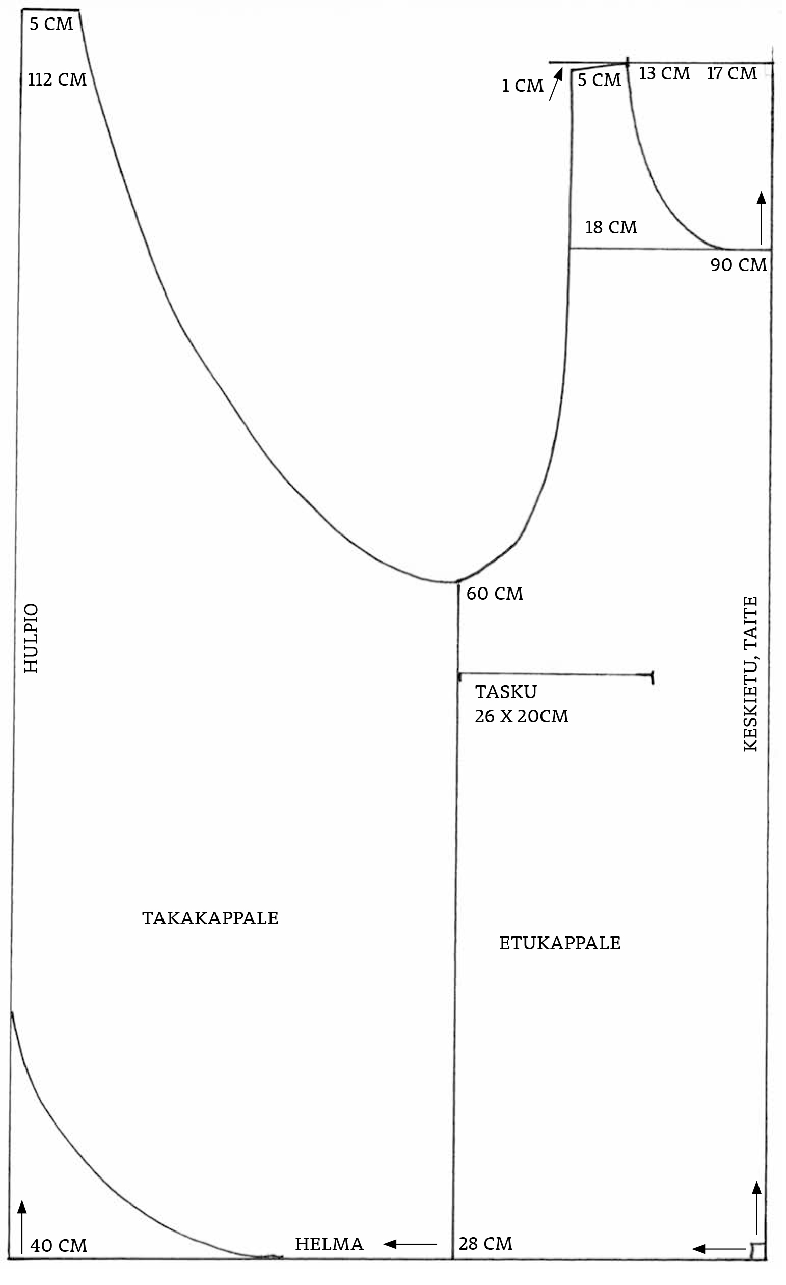 • Suurenna kaava silkkipaperille. Voit piirtää sen myös liidulla suoraan kaksin kerroin taitetun kankaan nurjalle. Kaava sisältää saumanvarat.