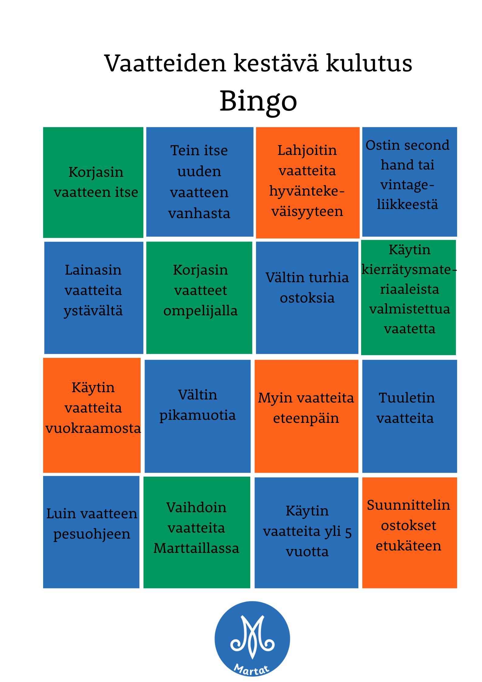 Kestävä vaatteiden -kulutus bingo. Rastittakaa bingo-pohjasta ne ruudut, jotka olette tehneet viimeisen kuukauden/puolen vuoden aikana. Keskustelkaa, miksi asiat oli nostettu bingoon.